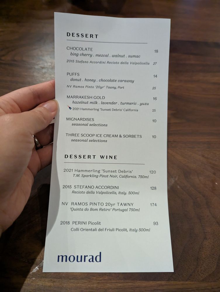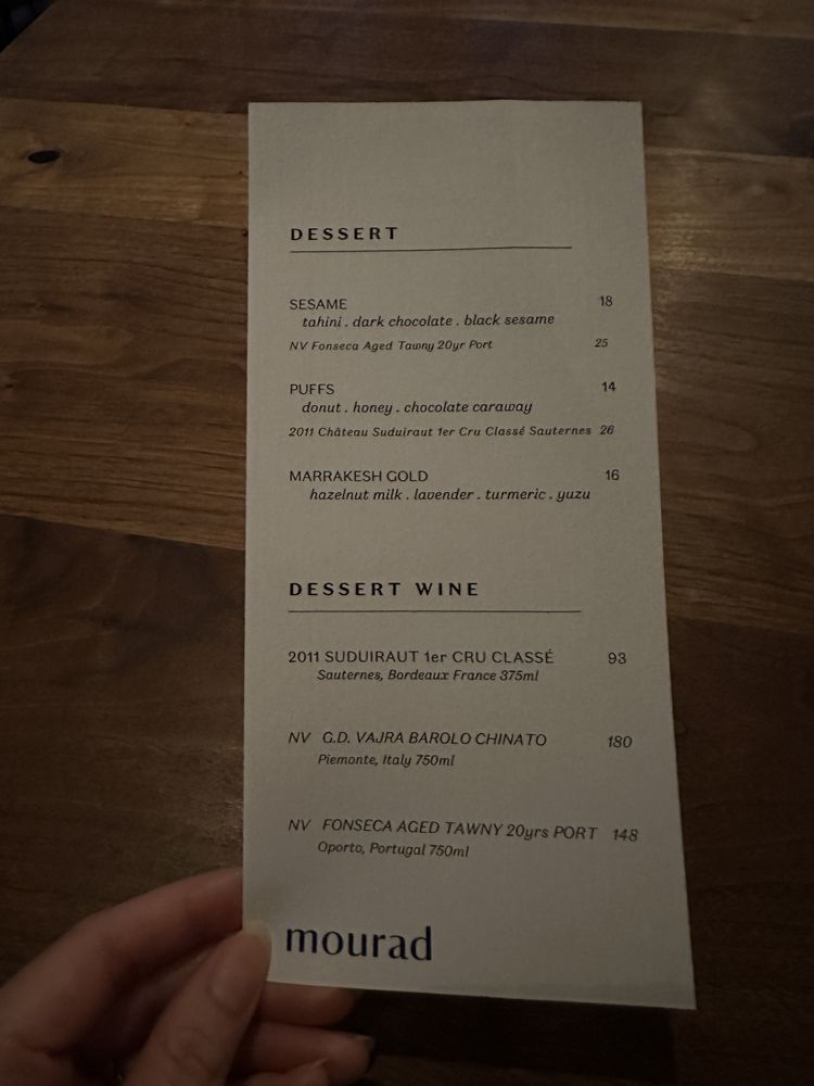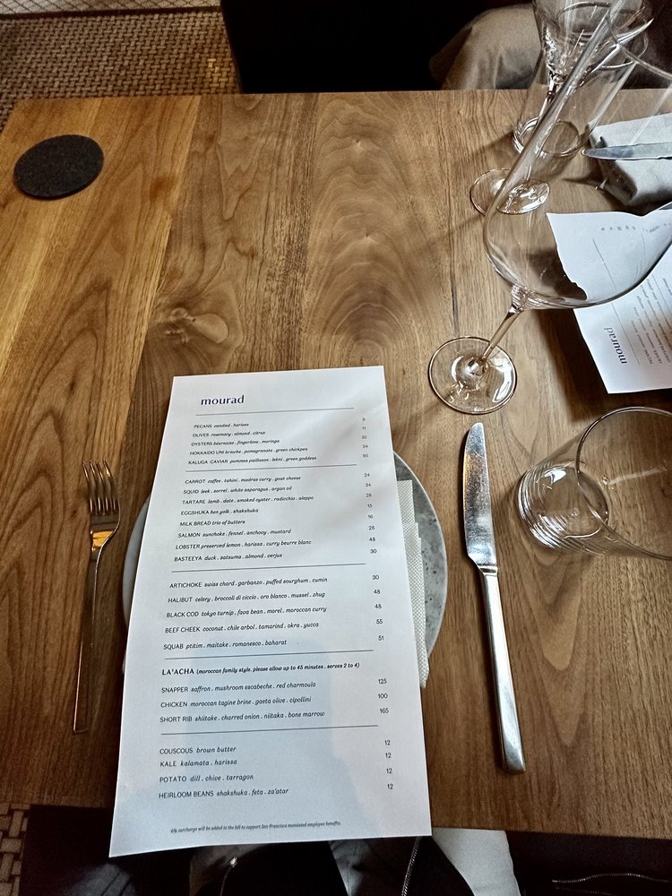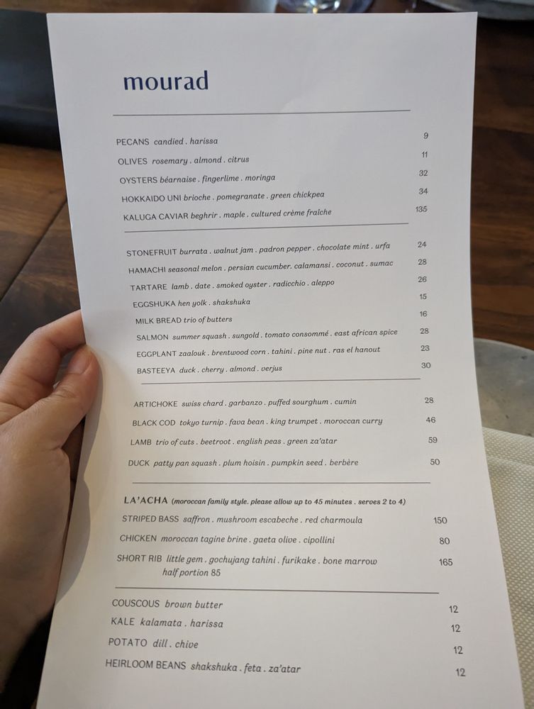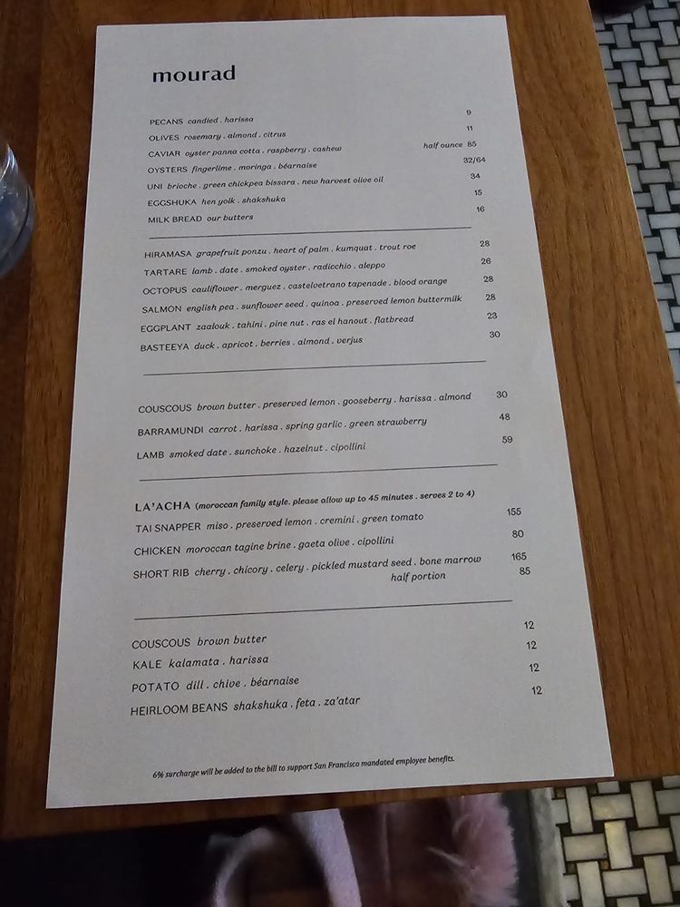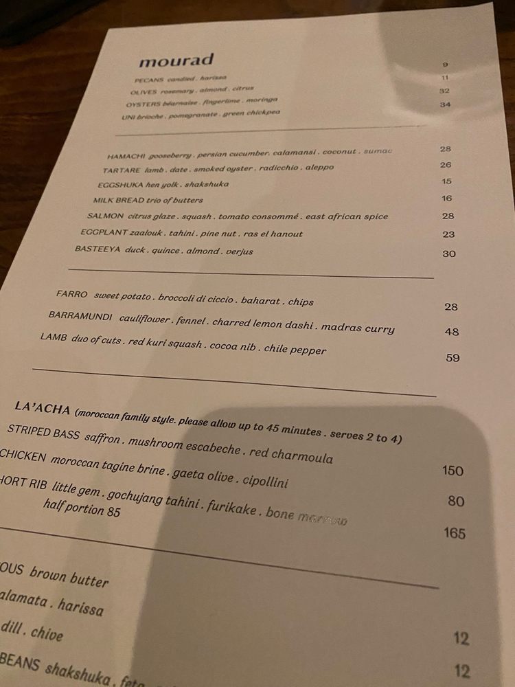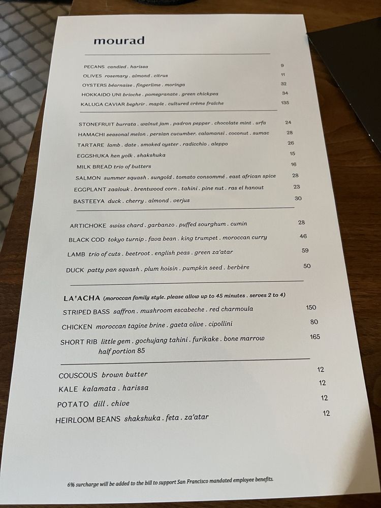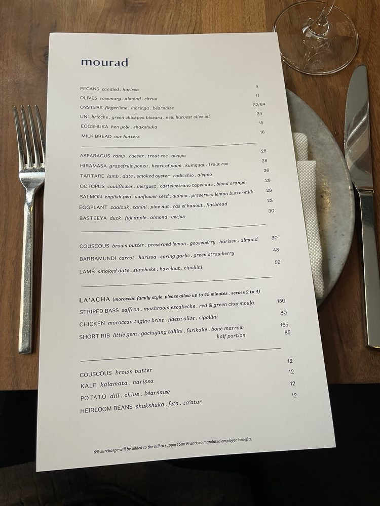 Introducing the menu at Mourad Restaurant, a trendy and upscale spot in San Francisco, offers a range of options for diners. From Pescatarian to Vegan choices, the menu caters to a variety of dietary preferences. The ambiance is classy and inviting, perfect for a dinner with friends or a special celebration. Customer reviews rave about the food quality, with standout dishes like the duck pastry (bastiya) and the tender short rib receiving high praise. The menu also features unique items like the eggplant zaalouk and the flavorful milk bread. With attentive service and a focus on flavor combinations, Mourad Restaurant promises a memorable dining experience.